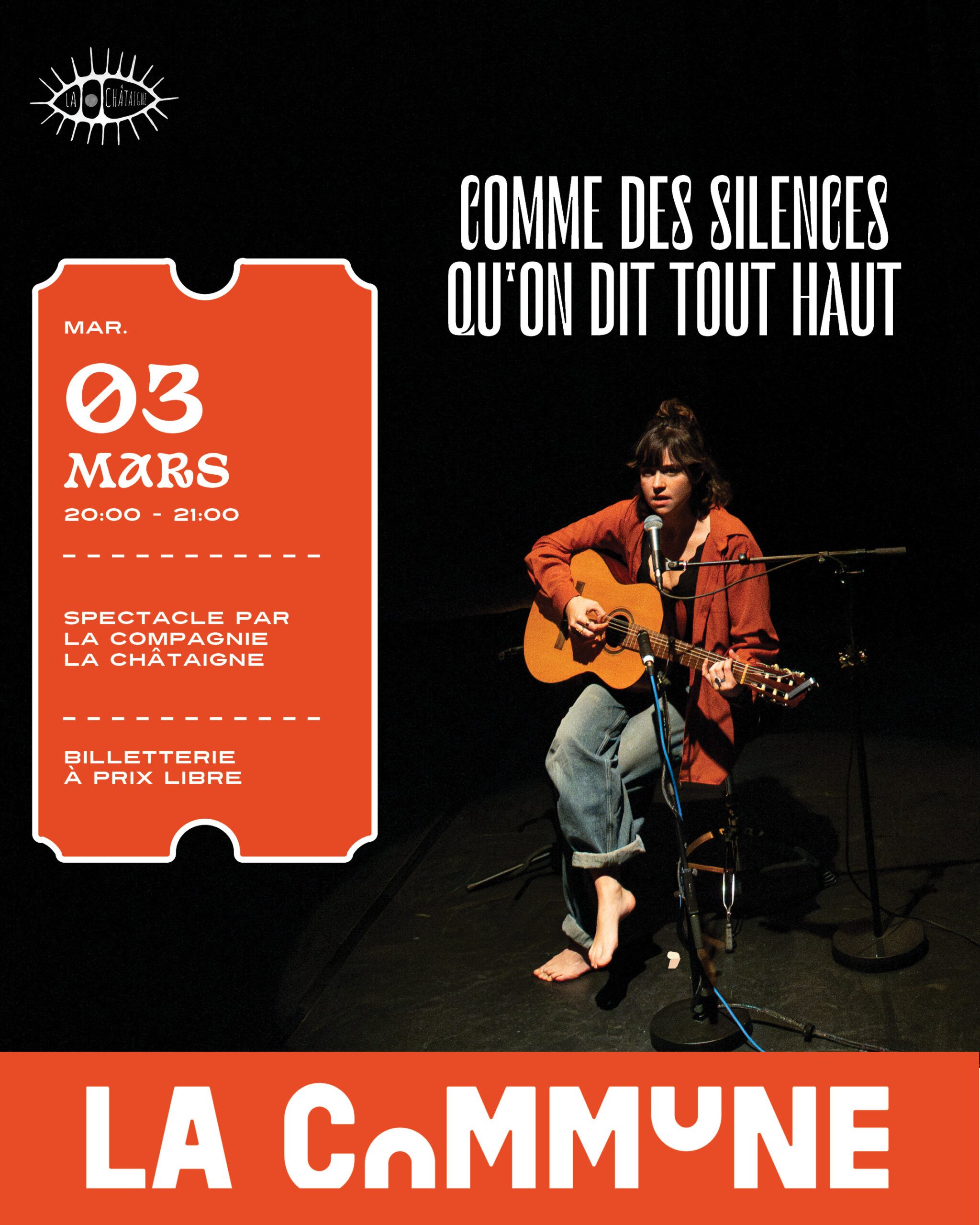 Sur scène, une femme et sa guitare explorent l’amnésie post-traumatique, la mémoire du corps et la transformation de la violence en force créative. Ce récit cathartique, à la fois brut et poétique, raconte un parcours de reconstruction personnelle et propose une vision du monde profondément vivante et résiliente.
