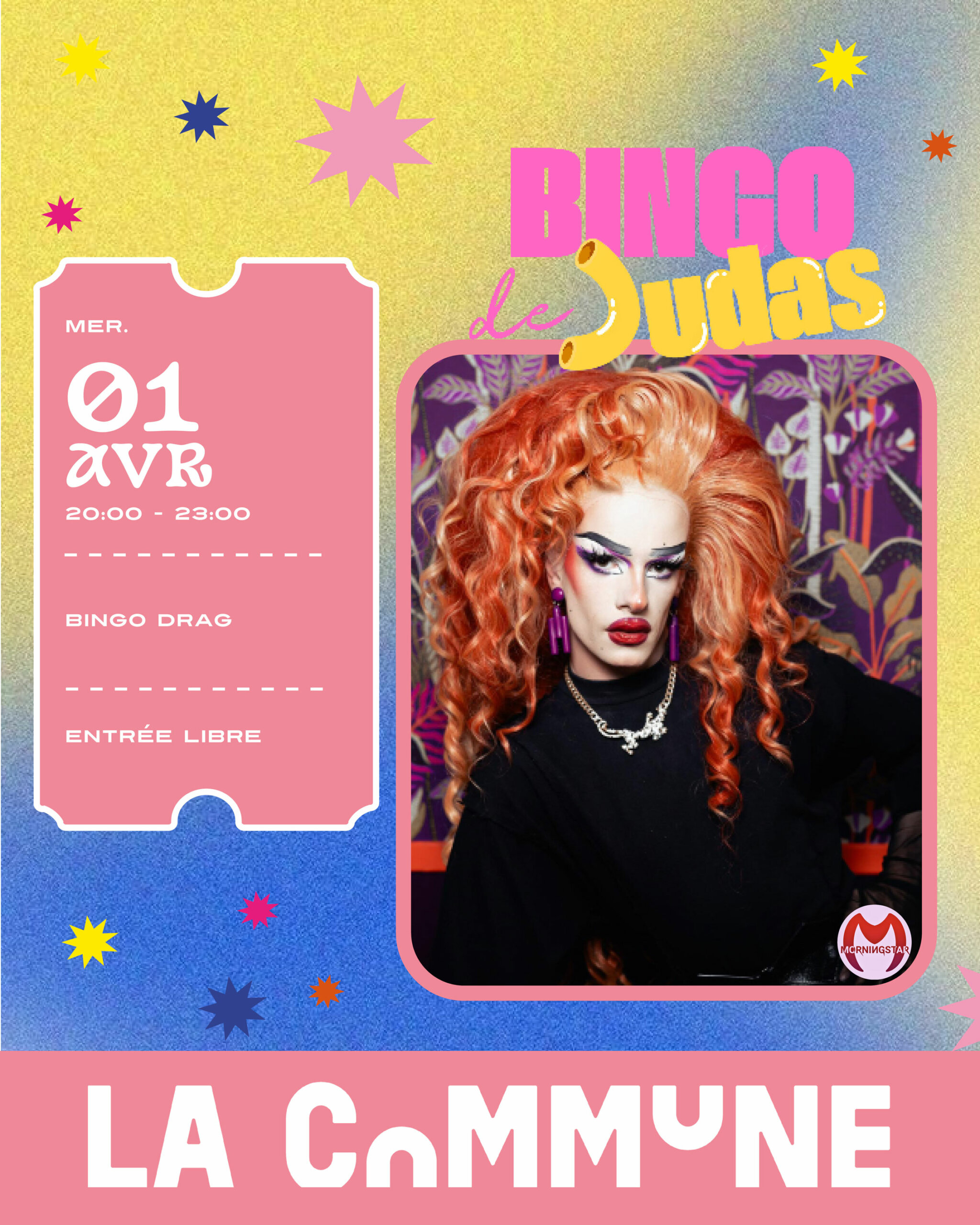 Un bingo animé par la drag queen Judas Morningstar avec humour décalé, punchlines et interactions. Première grille offerte, 2 € pour rejouer, lots à gagner.